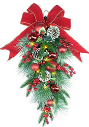24" Pre-lit Decorative Teardrop Swag, Battery Operated Christmas Swag with Fairy Lights, Red Bowknot & Baubles, Pine Cones, Red Berries, Green Leaves Holly, Spruce Branches, Pine Needles more . . .